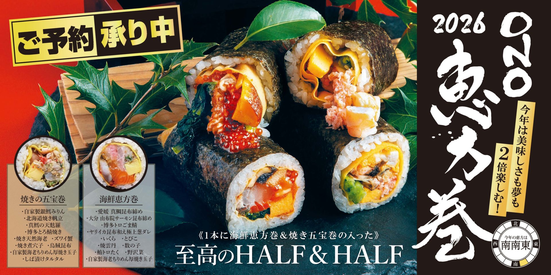 寒さが身に染みる季節となりました。。 新年もスタートしましたが、皆様いかがお過ごしでしょうか♪ 今年も豪華な1本に海鮮と焼き五宝の2種が入った、至高のHALF&HALF恵方巻を販売いたします★ ONO GROUPの恵方巻はネタにこだわっておりまして、漁港・市場直送の新鮮な魚介をはじめ で